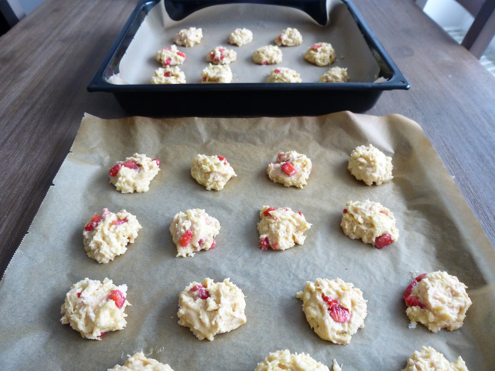4. Erdbeeren in kleine Würfel schnibbeln und unter den Teig heben. Dann den Teig entweder mit Hilfe eines Spritzbeutels oder eines Espressolöffels in die Miniguglform geben. Bei 180 Grad ca. 15 Min. backen.